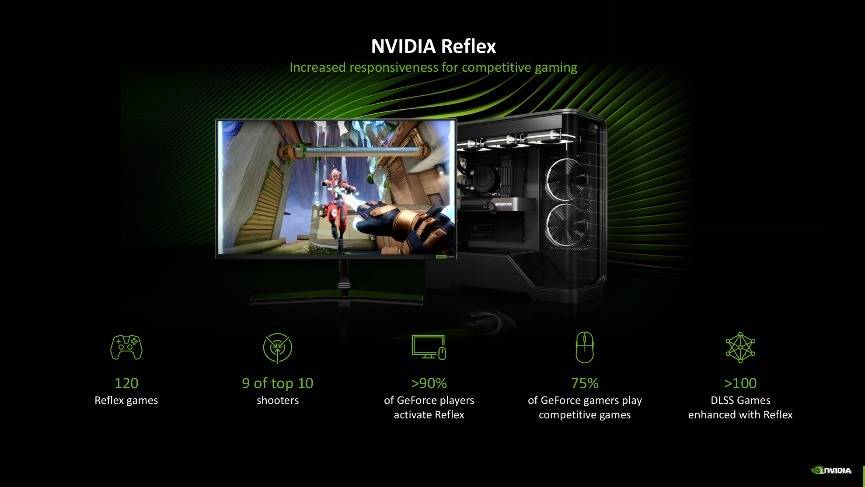 为了尽可能的降低延迟所带来的不良游戏体验,NVIDIA发布了NVIDIA Reflex技术,它可以使GPU和CPU同步,确保最佳响应速度和低系统延迟。目前NVIDIA Reflex已集成到超过100款游戏中,可以将PC延迟降低50%。
