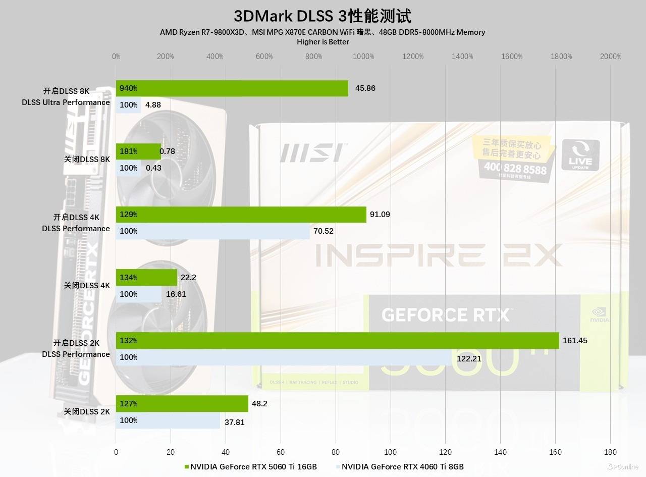 还是老样子,先跑3DMark的DLSS 3性能测试。微星GeForce RTX 5060 Ti INSPIRE 2X 硬派师16GB在2K分辨率下,对比RTX 4060 Ti,性能提升幅度大概在32%左右,4K分辨率下,开启DLSS 3以后性能领先也基本维持在29%,考虑到两张显卡的CUDA核心仅有5%左右的差距,只能说老黄确实是有点东西,单是凭借Blackwell架构就让性能再次起飞。