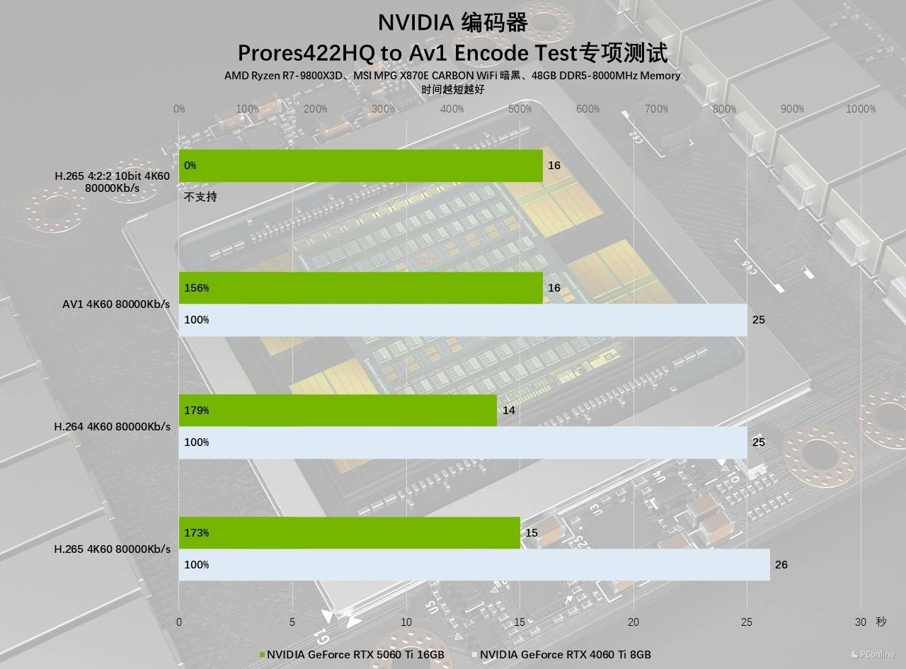 在Adobe以及达芬奇的Benchmark测试里,微星GeForce RTX 5060 Ti INSPIRE 2X 硬派师16GB相比RTX 4060 Ti也有提升,不过提升比较大的还是视频编辑部分,究其原因还是这一代RTX 50系显卡对编码器进行了升级,不仅编解码的效率更高,同时支持的格式也更丰富。例如在达芬奇和PR的测试中,微星GeForce RTX 5060 Ti INSPIRE 2X 硬派师16GB领先RTX 4060 Ti约23-28%,总体来说就是内容创作的效率更高了。