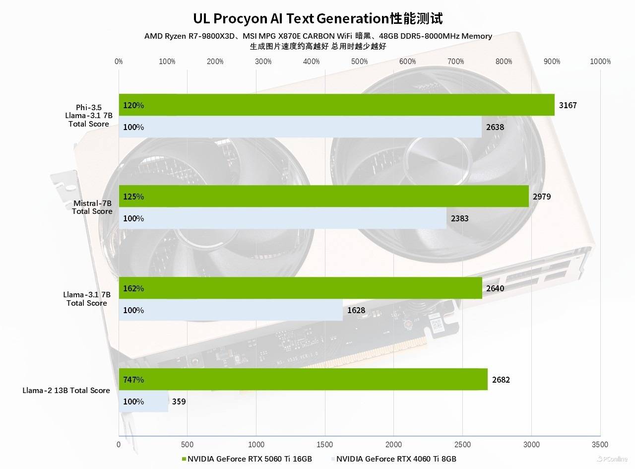 接着我们又用UL Procyon的AI Text Generation测试了更多的大语言模型,微星GeForce RTX 5060 Ti INSPIRE 2X 硬派师16GB的优势依旧十分明显,在以Llama 3.1 7B LLM打造的Phi-3.5测试中,新一代显卡取得3167分的成绩,相比RTX 4060 Ti提升了20%,将参数扩大至13B的Llama 2的测试,微星GeForce RTX 5060 Ti INSPIRE 2X 硬派师16GB也能对答如流,不过RTX 4060 Ti 8GB的显存就显得捉襟见肘了,回答速度极慢,几乎不可用,整体性能被RTX 50系甩在后面,差距有6倍以上。