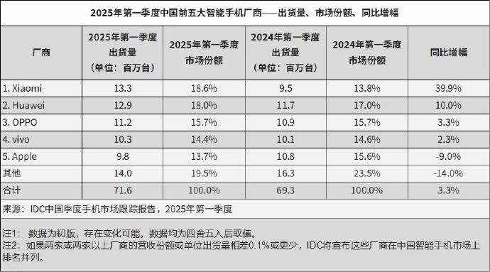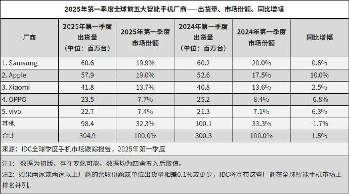 — 2025年Q1中国智能手机市场增长强劲,小米强势登顶 —
