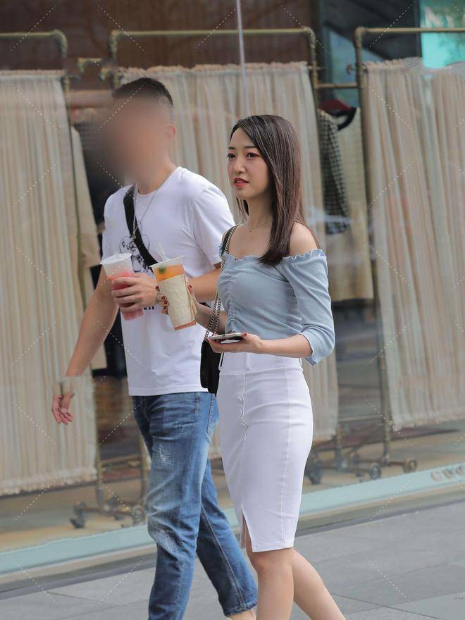 — 白色的半身裙,搭一件蓝色的一字肩,加上花边的设计,清新甜美 —