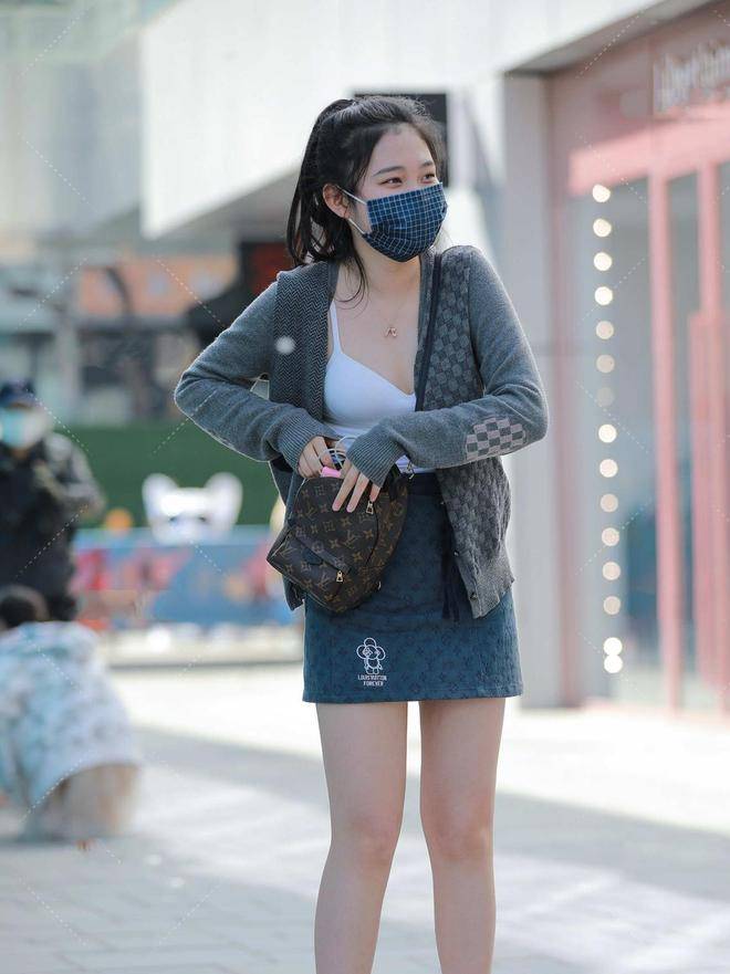 — 灰色开衫搭配蓝色半身裙,暖调和中性色的组合,彰显温婉风格 —