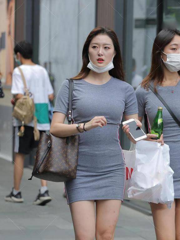 — 灰色修身裙,褶皱设计更显时髦洋气,搭配粉色手提包,更显少女感 —