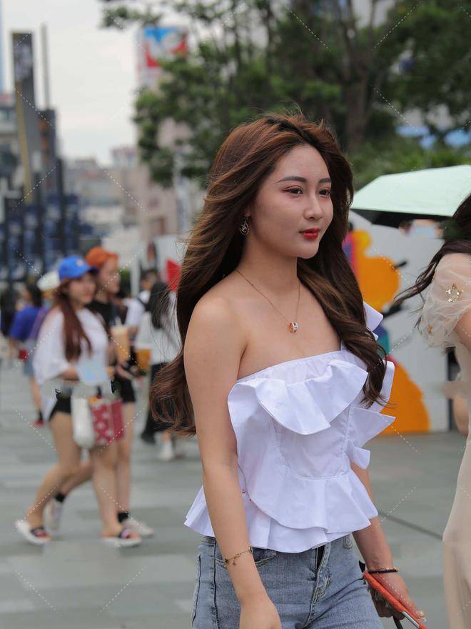 — 白色一字肩,荷叶边装饰尽显甜美可爱,搭配修身牛仔裤,时髦洋气 —