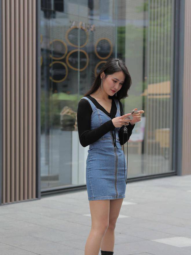 — 清新时尚的牛仔裙,搭配黑色的中筒靴,时尚感也太强了吧 —