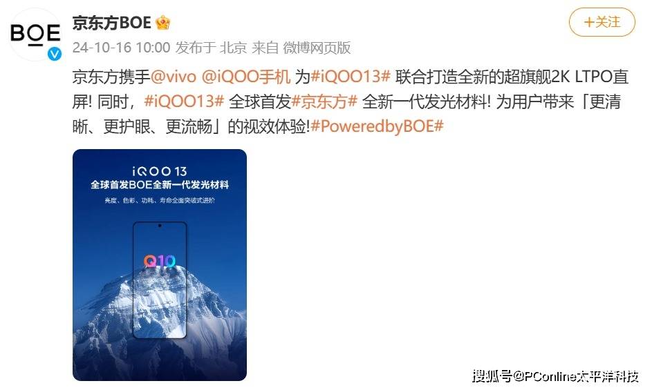 再造巅峰!iQOO 13×BOE联合定制2K Q1....推荐人:丁丁小编 发布时间:2024-10-16 16:15:01