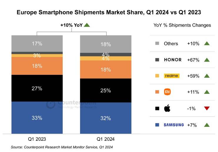 欧洲智能手机市场Q1季度强劲复苏:三星、苹果、小米....推荐人:丁丁小编 发布时间:2024-05-23 18:09:58