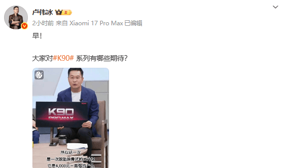 小米卢伟冰官宣REDMI K90 Pro Max本....推荐人:丁丁小编 发布时间:2025-10-16 14:50:58
