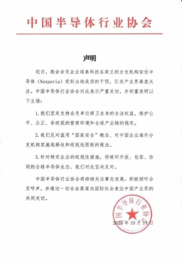 中国半导体行业协会就荷兰干预安世半导体发声推荐人:丁丁小编 发布时间:2025-10-14 11:33:09