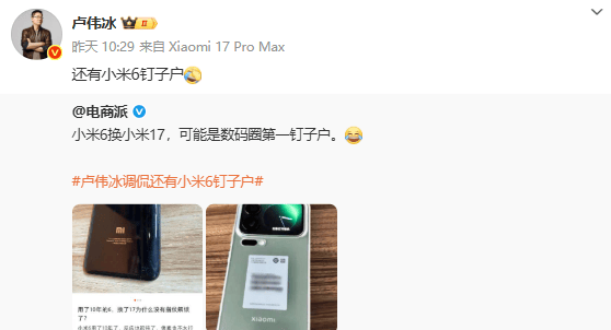 卢伟冰调侃仍有小米6“钉子户” 十年用户终换新机推荐人:丁丁小编 发布时间:2025-10-13 12:33:07