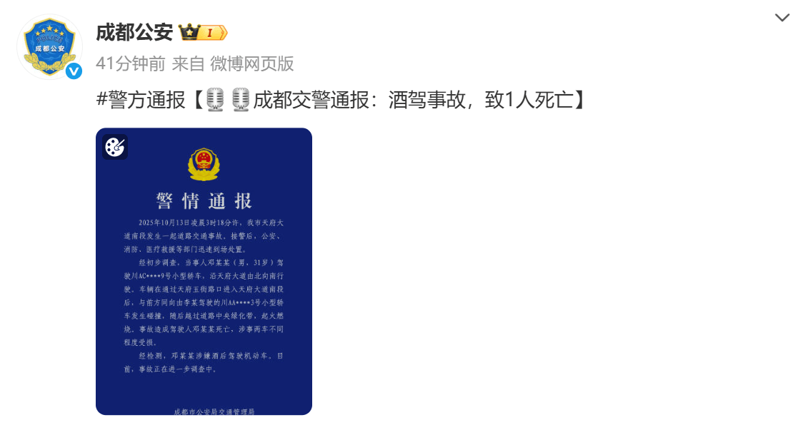 警方通报小米成都车祸:涉嫌酒驾,致1人死亡推荐人:丁丁小编 发布时间:2025-10-13 16:50:59