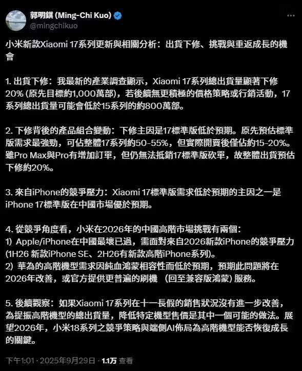 郭明錤:小米17系列出货量下调约20%,标准版需求....推荐人:丁丁小编 发布时间:2025-09-29 15:32:57