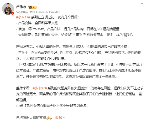 卢伟冰称小米17首销结果很不错,Pro Max版本....推荐人:丁丁小编 发布时间:2025-09-29 17:17:50
