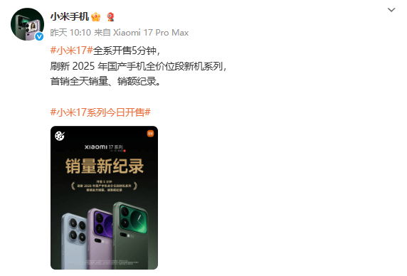 小米17开售5分钟刷新2025年国产手机销售纪录推荐人:丁丁小编 发布时间:2025-09-28 11:47:56