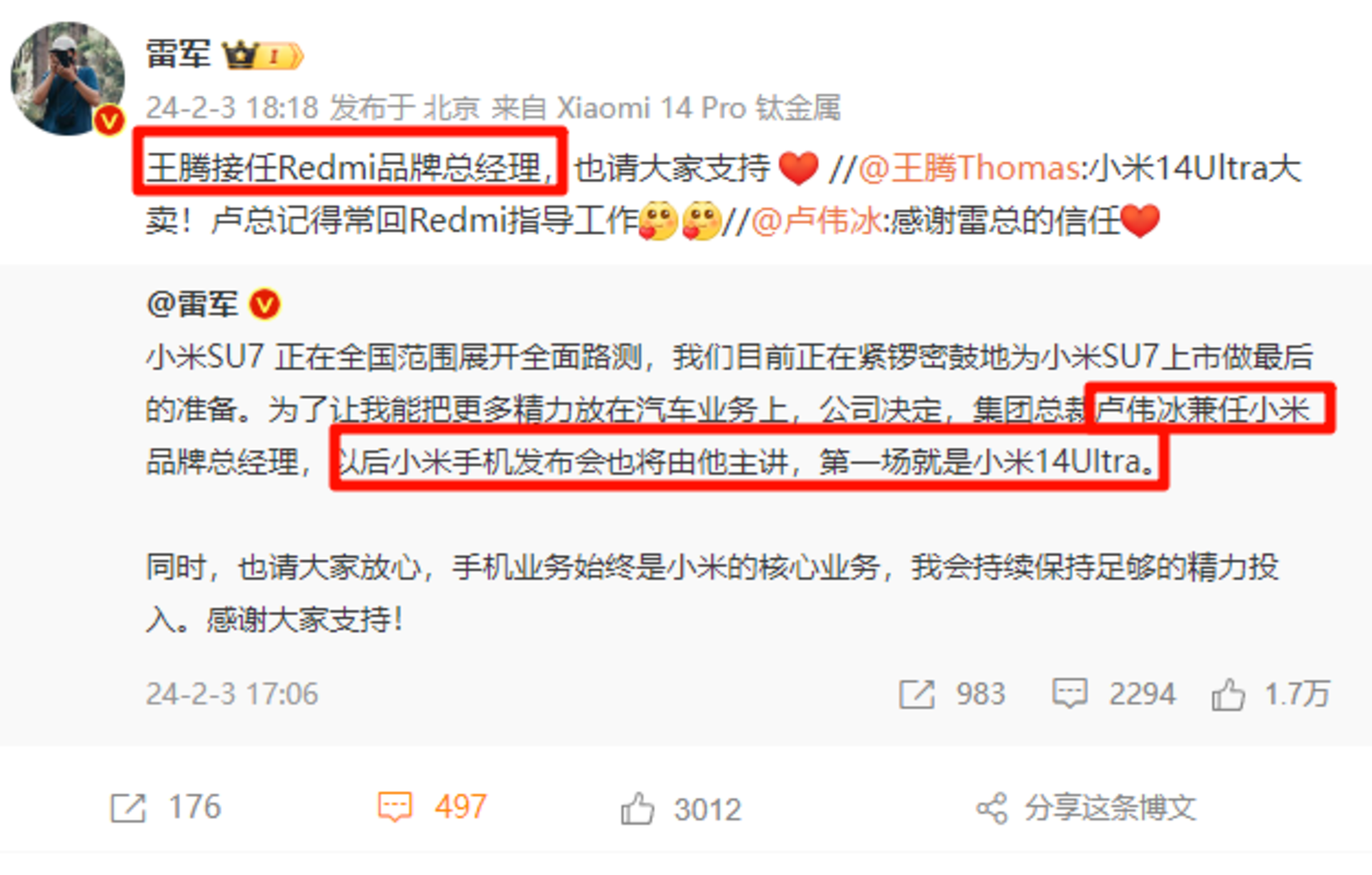 金品质立天下!卢伟冰/王腾接任小米/Redmi总经....推荐人:丁丁小编 发布时间:2024-02-05 08:10:03
