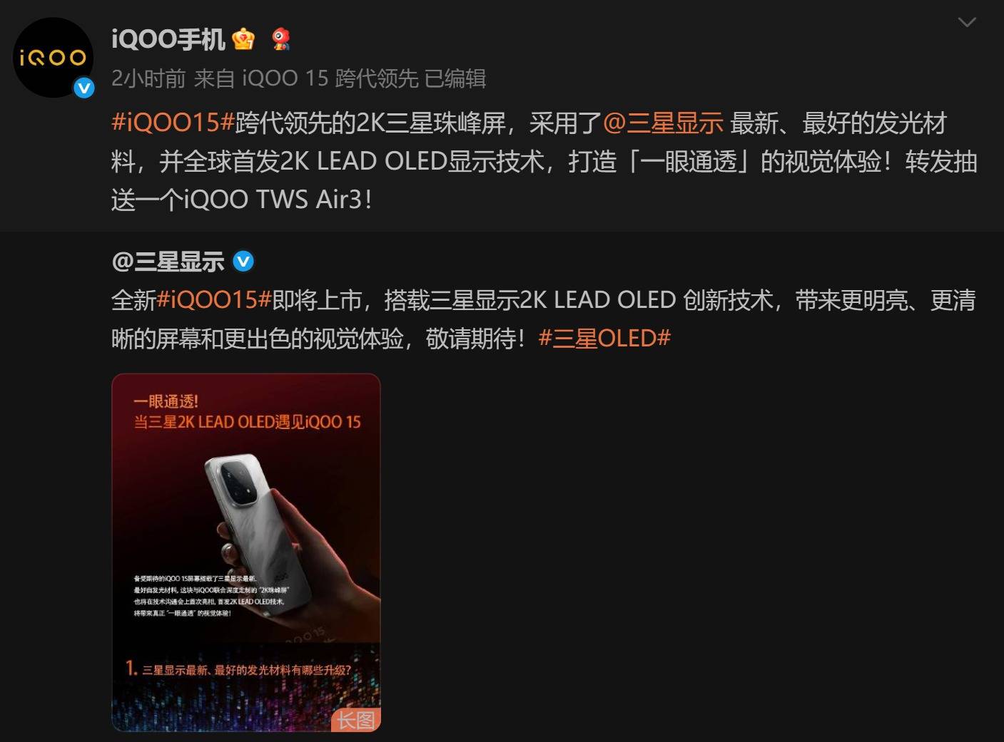 iQOO 15官宣搭载2K三星珠峰屏!一眼通透的视....推荐人:丁丁小编 发布时间:2025-09-23 18:33:01
