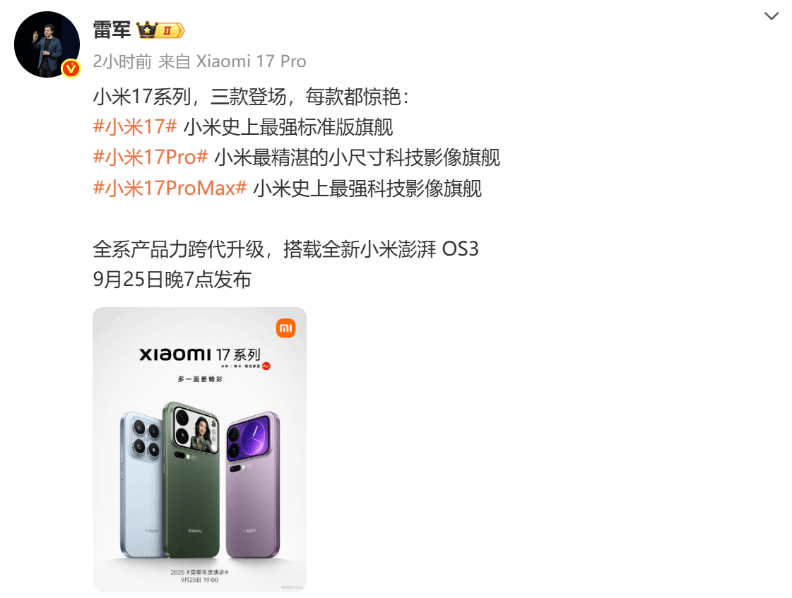 雷军官宣小米17系列将于9月25日发布 全面对标i....推荐人:丁丁小编 发布时间:2025-09-22 12:54:14