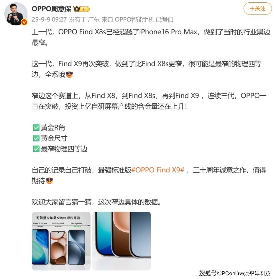 OPPO Find X9正面图首曝:最窄物理四等边....推荐人:丁丁小编 发布时间:2025-09-09 14:17:58