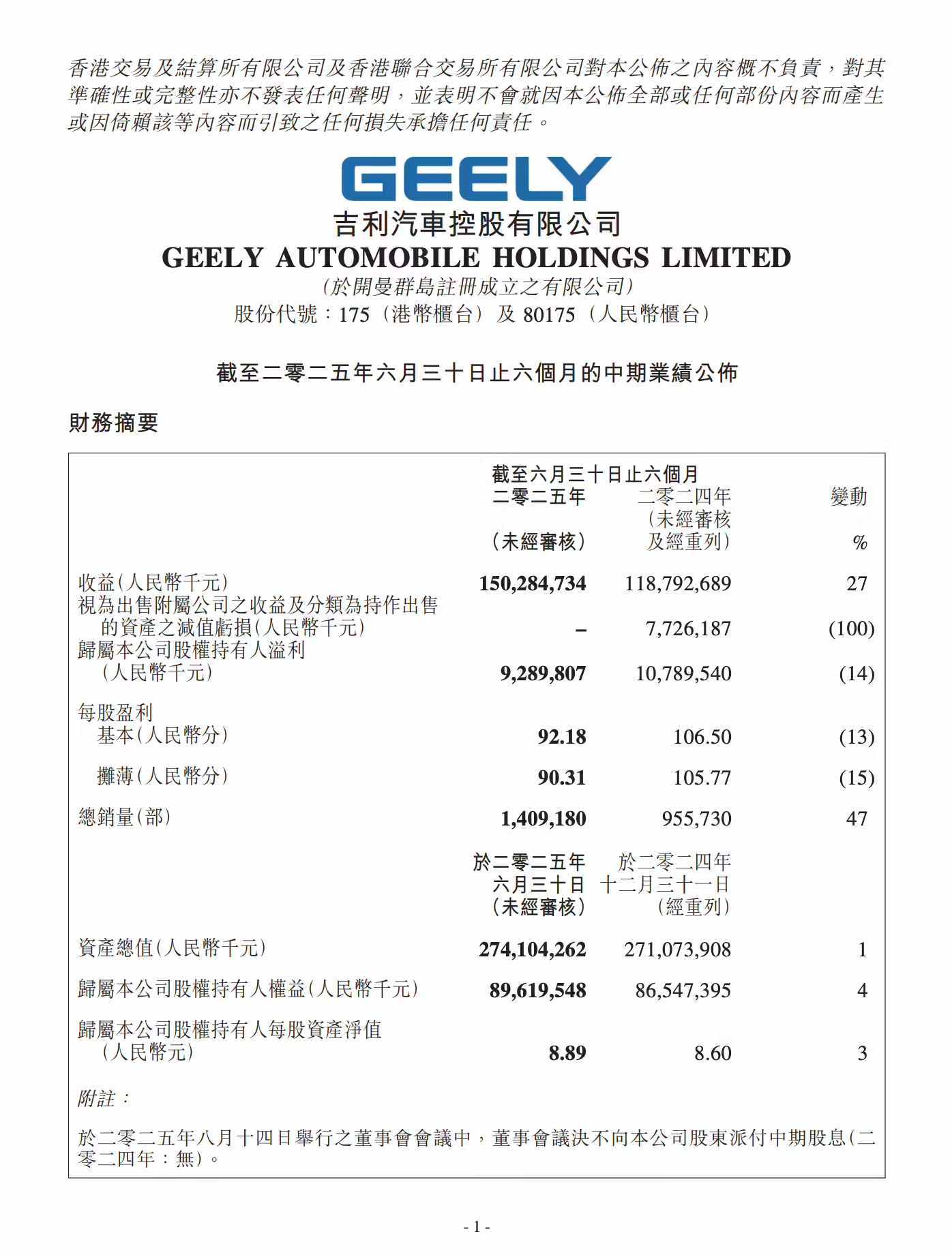 吉利汽车上半年业绩创历史新高:营收首破1500亿大....推荐人:丁丁小编 发布时间:2025-08-14 16:12:02