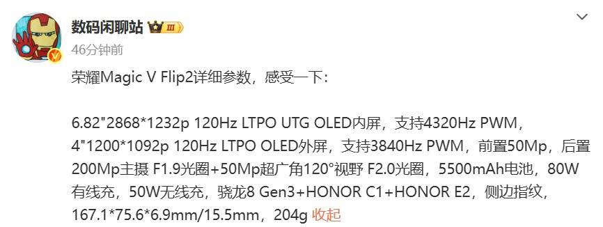 荣耀Magic V Flip2全参数曝光:骁龙8G....推荐人:丁丁小编 发布时间:2025-08-14 16:57:01