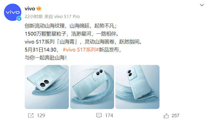 vivo S17系列新品即将发布:新增「山海青」配....推荐人:丁丁小编 发布时间:2023-05-29 11:14:44