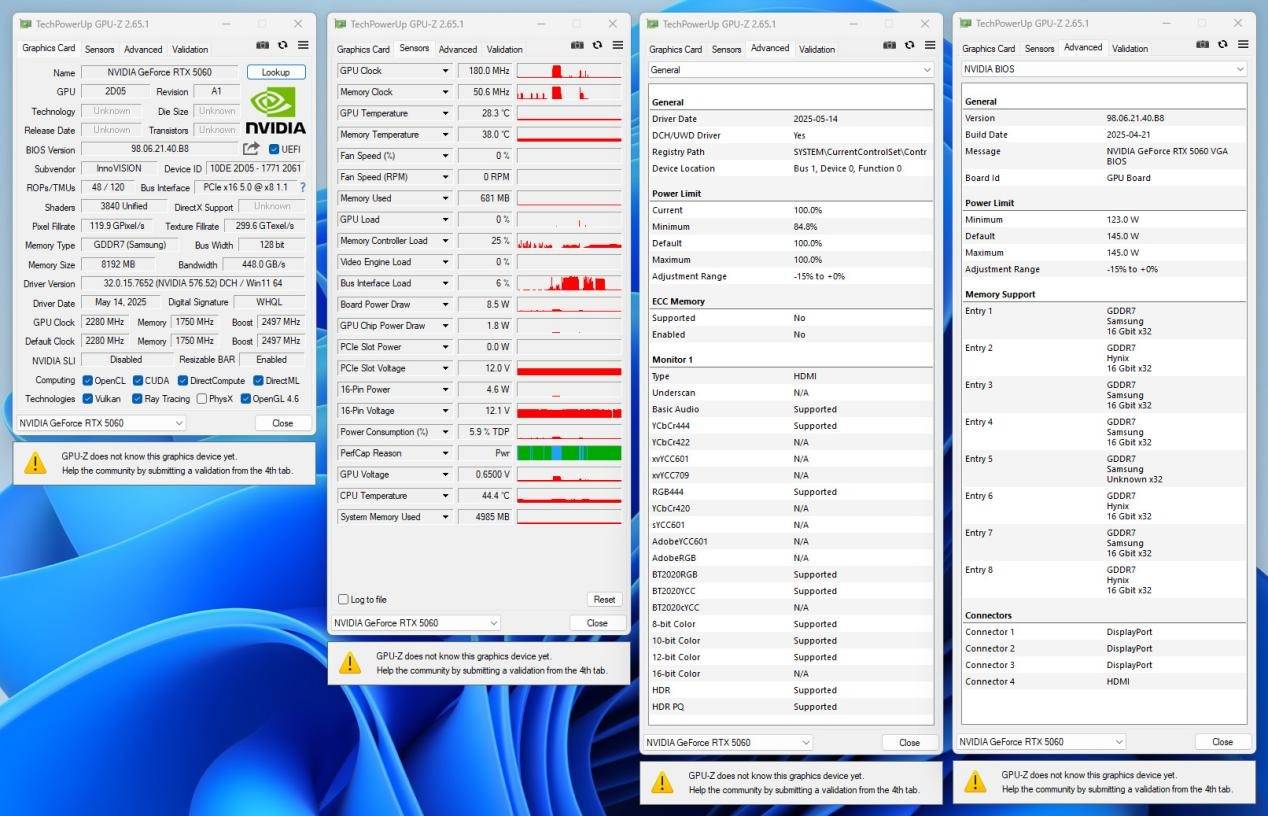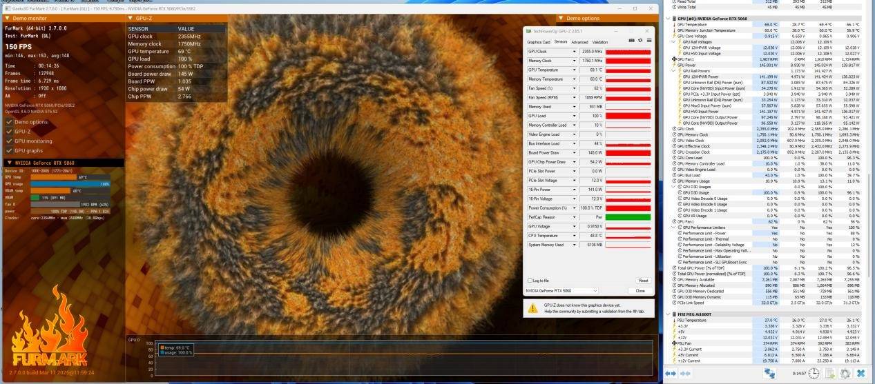最后一项测试烤机,这也是许多玩家关注的重点。得益于映众RTX 5060曜夜出色的散热配置,整体表现非常出色。在室温23℃下,Furmark烧机10分钟后,整张显卡的温度并不高,核心仅有69度出头,显存温度则低于60度,非常凉快。显卡的功率则为145 W,风扇转速则是1899 RPM,噪音与温度控制还是很不错的。