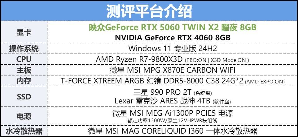 至于对标的测试显卡,我们这次拿出的RTX 4060 8GB、RTX 4060 Ti 8GB与映众GeForce RTX 5060 TWIN X2曜夜8GB显卡进行性能对比,分别对理论性能、游戏性能、DLSS性能、创作能力、AI性能,以及功耗等不同维度的表现。
