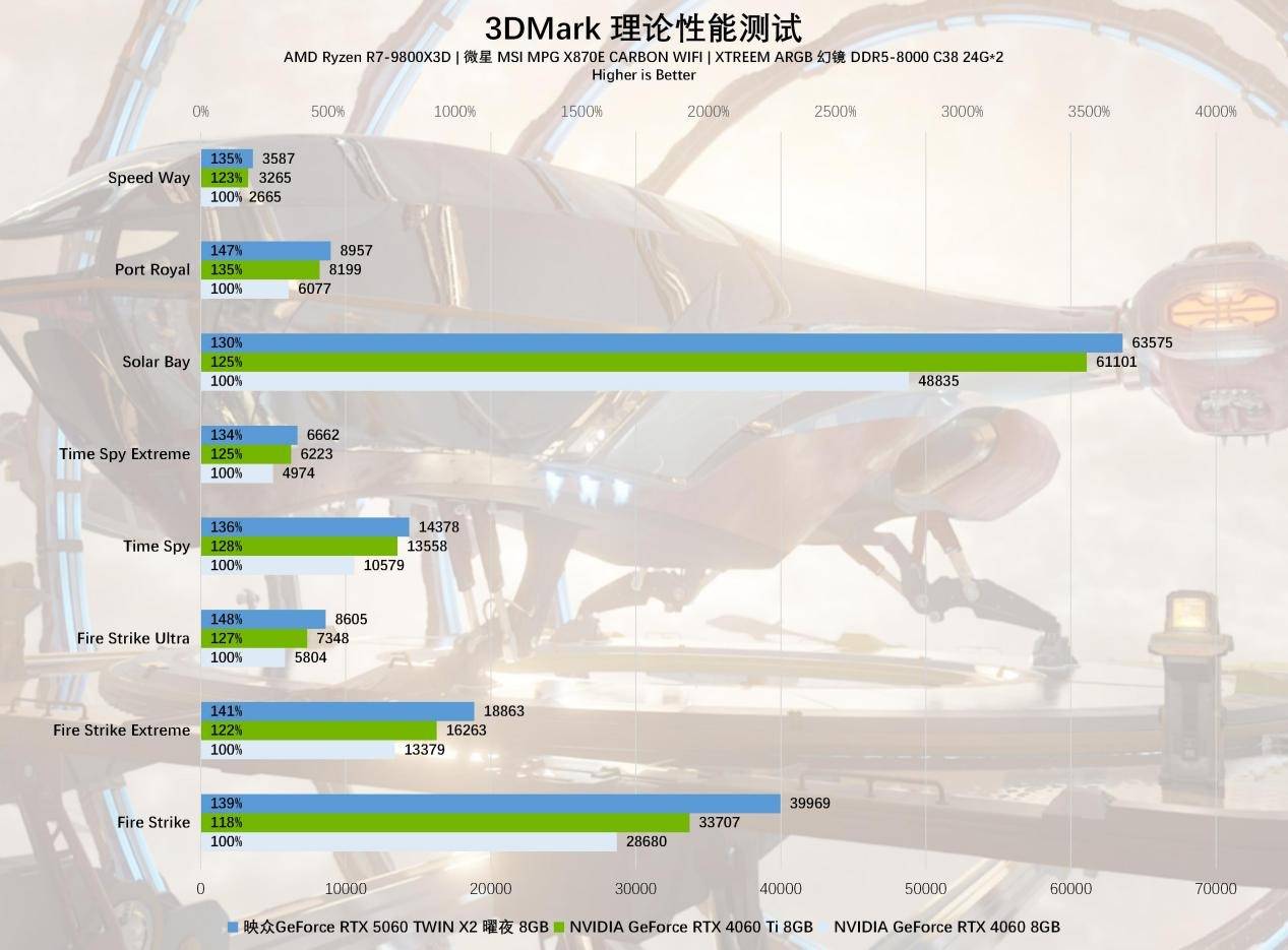 在理论性能的评估中,通过3DMark的Fire Strike系列测试,映众RTX 5060曜夜的表现引人注目。在1080P分辨率下,其性能相较于RTX 4060领先约39%,与RTX 4060 Ti相比也有18%的性能优势;在2K分辨率下,领先RTX 4060约41%,领先RTX 4060 Ti约22%;而在4K分辨率下,与RTX 4060的差距最大,性能提升达到48%,与RTX 4060 Ti相比也有27%的提升。此外,在以DX12为基准的Time Spy测试中,新显卡同样表现出色,相较于RTX 4060领先幅度达到36%,整体性能的提升相当显著。