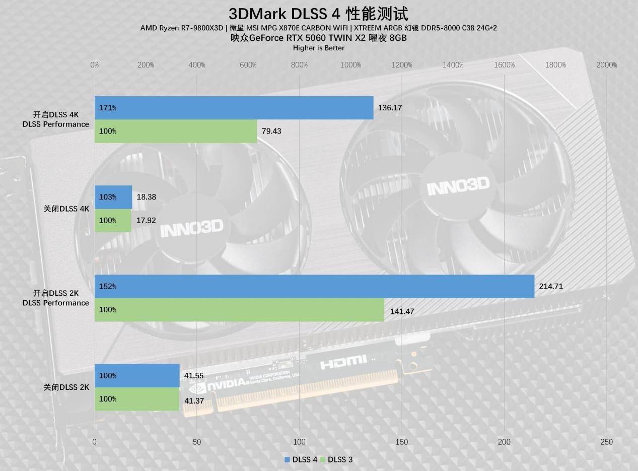 再看看DLSS 4的理论表现如何,还是经典的3DMark测试。不得不说映众RTX 5060曜夜搭配上DLSS 4后,帧数就跟打了鸡血一样,开关前后的性能简直天壤之别!其中2K分辨率下,开关前后性能差距足足有4倍之多。4K分辨率时帧数差距直接就是7倍。