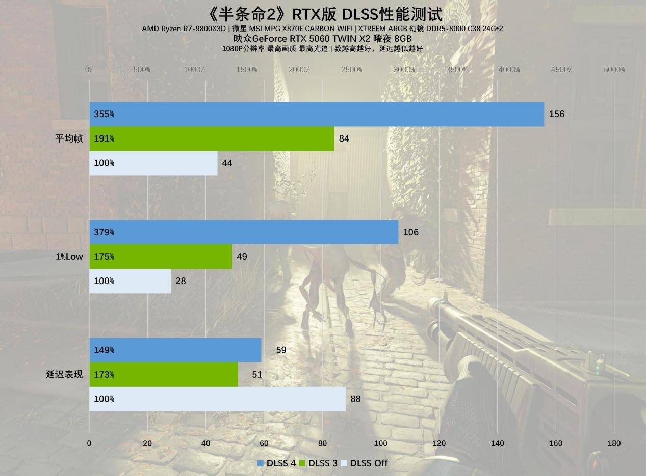 实测下来,只能说《半条命2》RTX版对硬件的开销极大,在原生1080P分辨率下,所有画质、光追均开至最高,不开启超分选项时,映众RTX 5060曜夜帧数为44 FPS。在开启DLSS 3质量档以后,游戏帧数来到了84 FPS,几乎快摸到高刷的门槛了,而继续开启DLSS 4质量档,游戏帧数飙升至156 FPS,对比原生1080P的表现,性能提升高达3.5倍!1%Low的表现也差不多,领先幅度接近4倍。