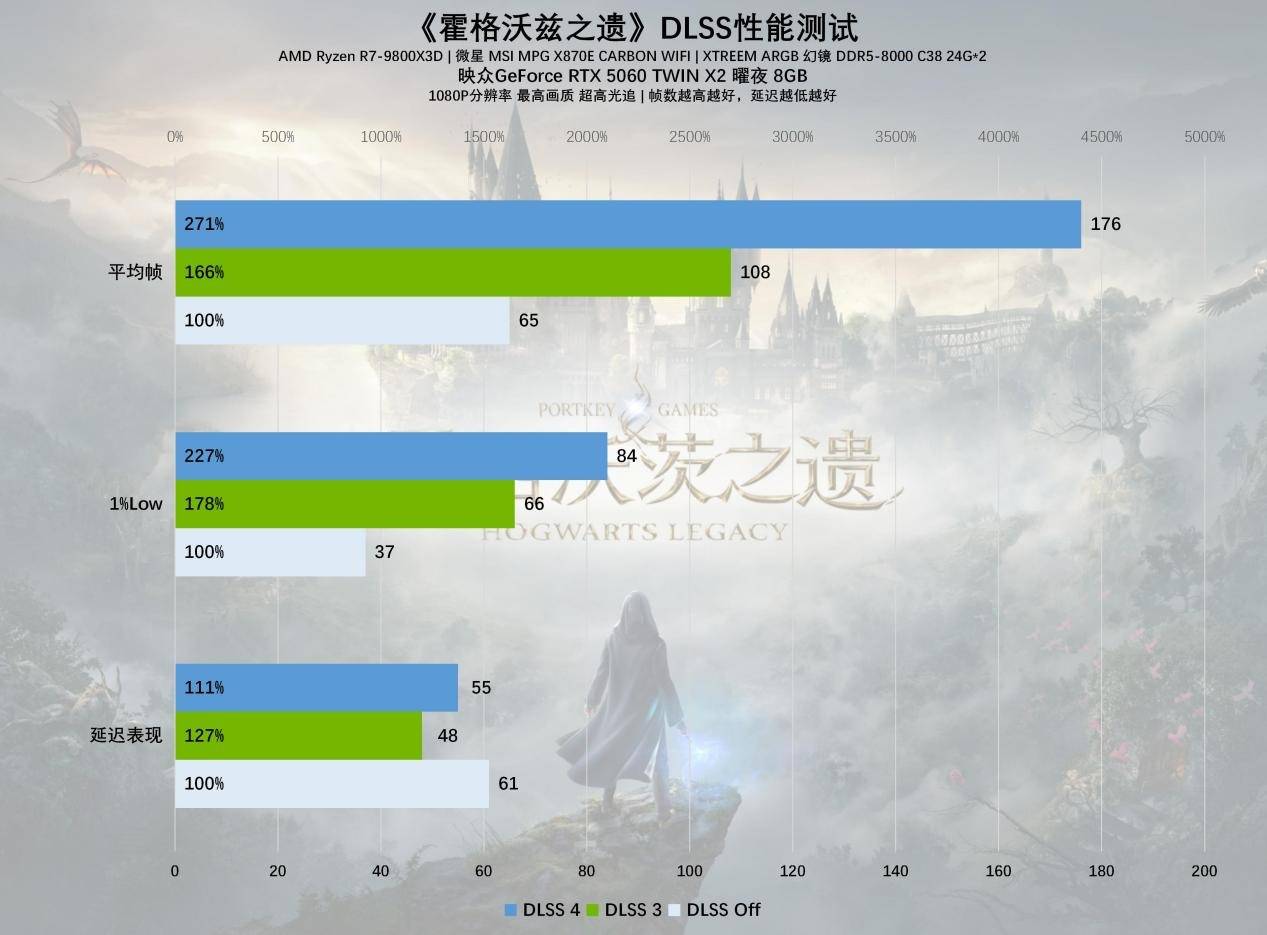 测试的第三款DLSS 4游戏是《霍格沃兹之遗》,实际测试过程中,我们发现《霍格沃兹之遗》这款游戏优化还是不错的,1080P分辨率画质光追均设置最高的情况下,映众RTX 5060曜夜在不开任何超分的情况下,平均帧为65 FPS。如果开启DLSS 3质量档,此时帧数已经能够做到108 FPS了,属于是高刷与画质的完美组合,体验相当丝滑。开启DLSS 4以后,帧数可以进一步提升至176 FPS,对比原生1080P的表现,性能提升了约3倍左右。