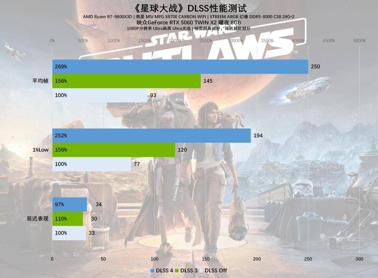 实测DLSS 4在这类优化欠佳的游戏中确实大有用处,在1080P原生分辨率下,映众RTX 5060曜夜的平均帧仅有77 FPS,整体游玩体验还不错。而开启DLSS 4质量档以后,游戏平均帧直接暴增至250 FPS,游戏体验如德芙般丝滑,对比原生1080P的表现,足足有2.7倍左右的提升。即便是对比DLSS 3的145 FPS,也是足足提升了100+ FPS。