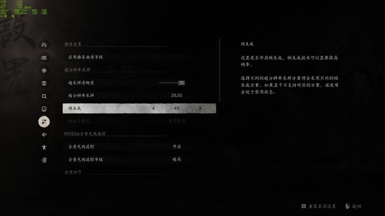 接下来我们再测一下第一款国产3A大作、去年的热门单机游戏《黑神话:悟空》,去年发售时,这款游戏也是率先支持了DLSS 3帧生成功能,如今它还支持了RTX 50系显卡的DLSS 4多帧生成,游玩体验将会更加顺畅,开启方式也很简单,在游戏菜单设置中即可找到4X的选项。