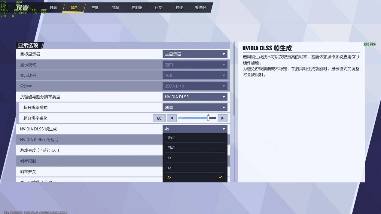 网游方面我们测的是《漫威争锋》,这款游戏在RTX 50系显卡首发之时,它还没有完全适配DLSS 4,玩家想要体验多帧生成功能还需要依靠NVIDIA App的DLSS 4优设功能。不过现在《漫威争锋》也正式支持DLSS 4了,与上面的游戏一样,玩家在游戏设置中就能直接开启,并且提供了2x、3x以及4x选项,玩家可以随意选择是插一帧、插两帧还是插三帧。