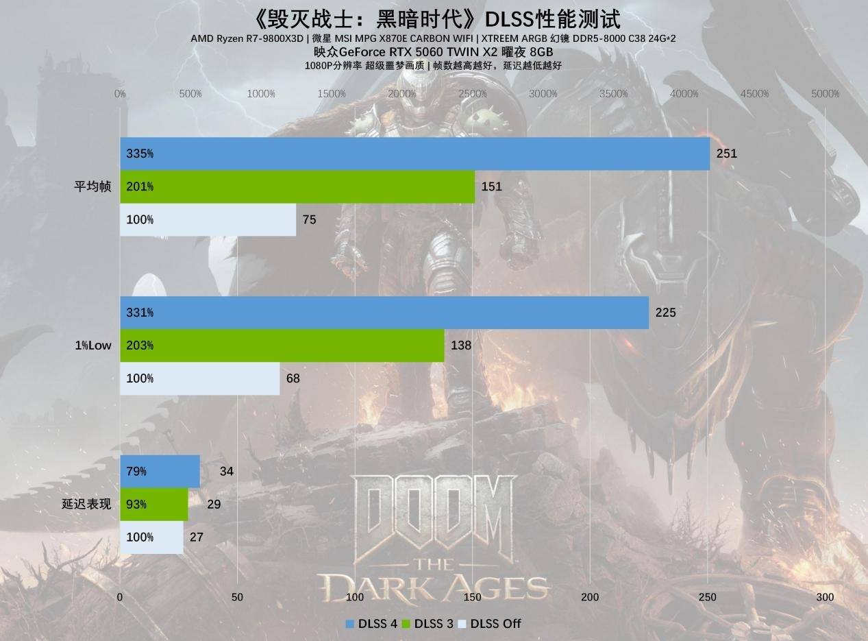 最后一款游戏我们测的是最近刚支持DLSS 4的《毁灭战士:黑暗时代》,实测iGame GeForce RTX 5060 Ultra W DUO OC 8G显卡在1080P分辨率、超级噩梦画质下,表现还是非常不错的,即便不开启超分,也能流畅游戏;开启DLSS 3质量档后,游戏帧数已经能够满足高刷需求了,接着启动DLSS 4质量档后,游戏帧数更是来到了250 FPS以上,完全的爽玩水准。