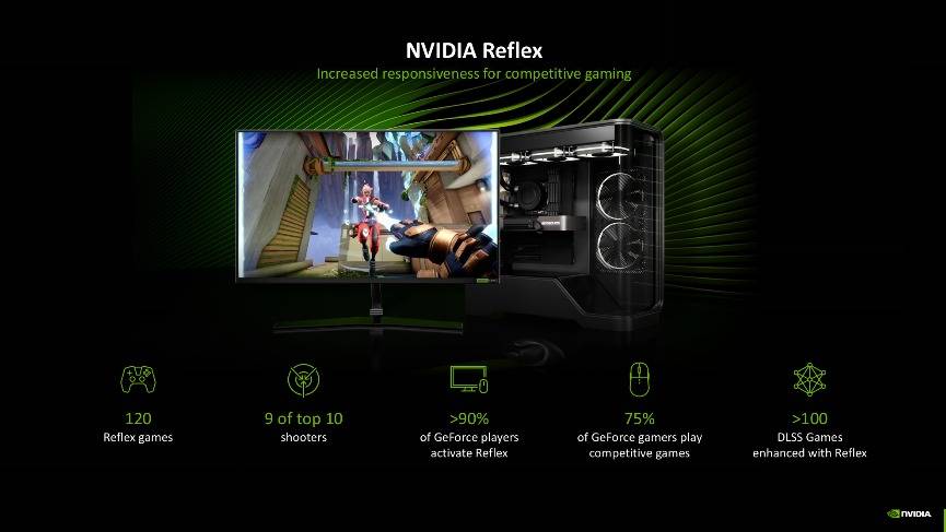 为了尽可能地降低延迟所带来的不良游戏体验,NVIDIA发布了NVIDIA Reflex技术,它可以使GPU和同步,确保最佳响应速度和低系统延迟。目前NVIDIA Reflex已集成到超过100款游戏中,可以将PC延迟降低50%。