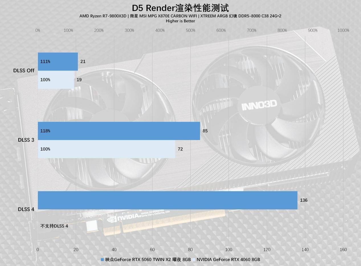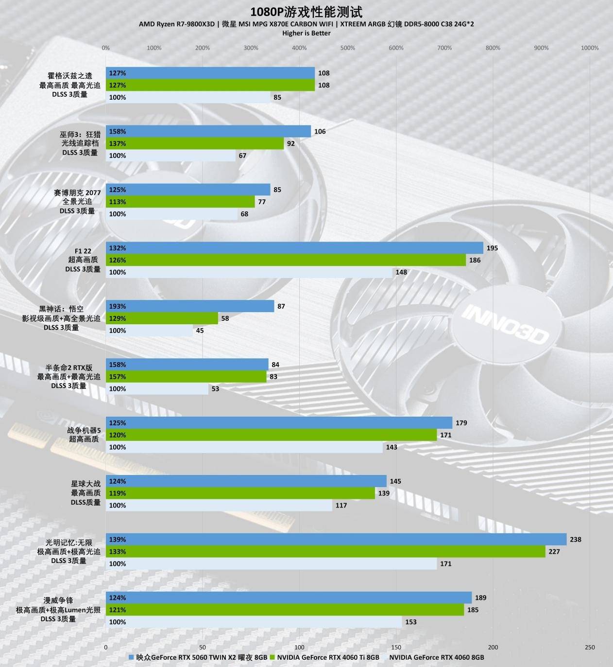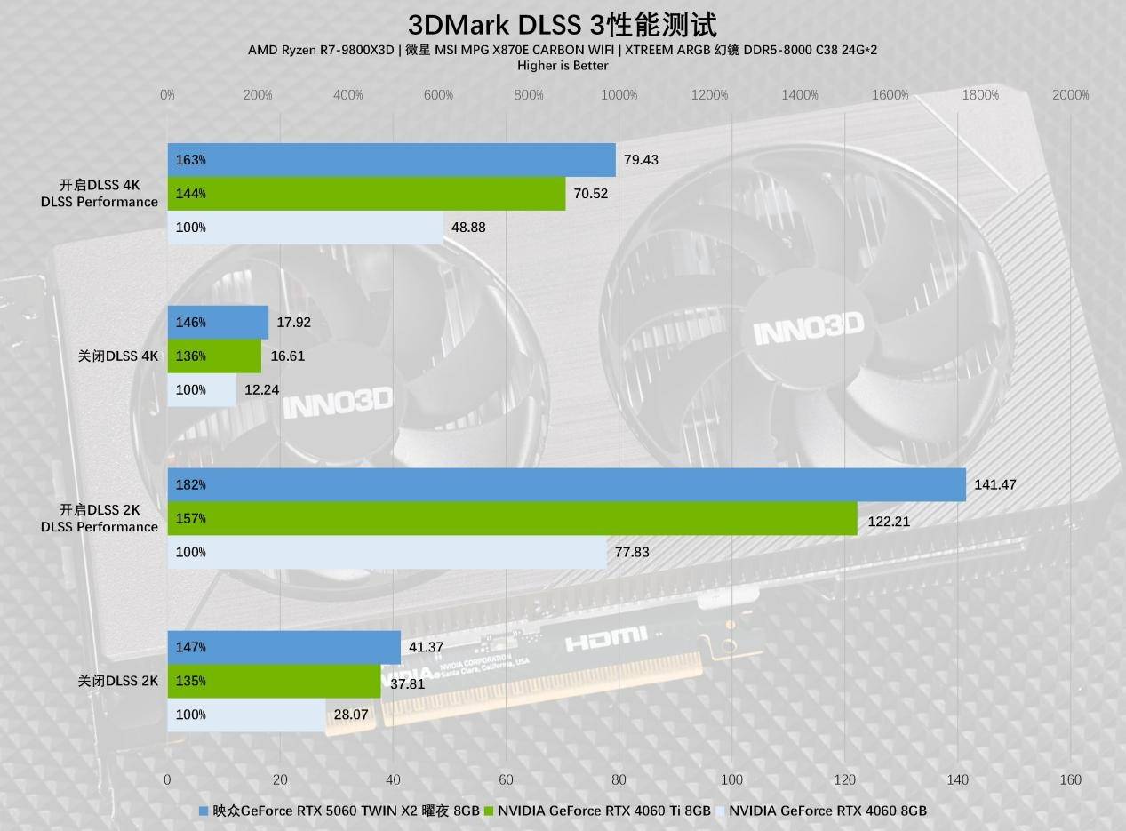 首先是3DMark的DLSS 3性能测试。映众RTX 5060曜夜在2K分辨率下,对比RTX 4060,性能提升幅度非常夸张,达到了82%,对比RTX 4060 Ti则是25%;4K分辨率下,开启DLSS 3以后,对比RTX 4060性能领先也基本维持在80%以上,而对比RTX 4060 Ti同样拉开了不小的差距,接近40%的性能提升只能说老黄确实有点东西。