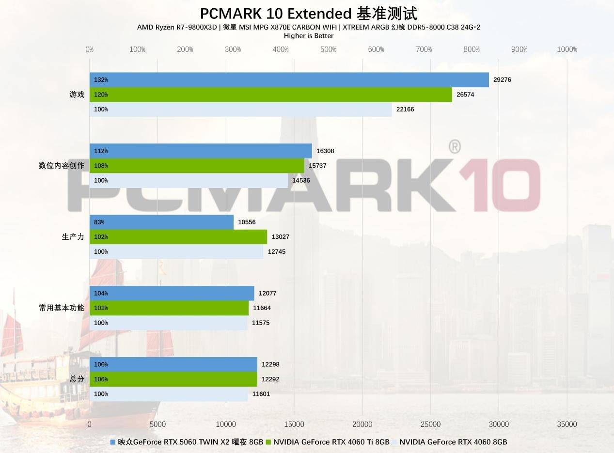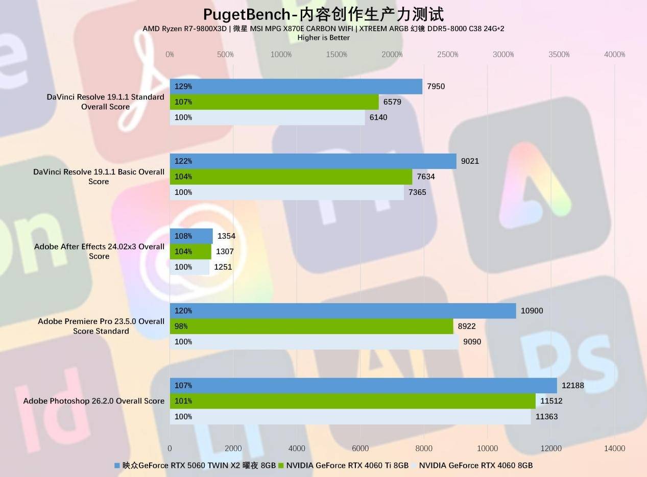 看过了游戏,下面就是专业创作领域的内容了。先给大家伙看一下综合场景的性能表现,在PCMark10 Extended测试,映众RTX 5060曜夜在游戏、数位内容创作方面的表现更佳,基本上要比RTX 4060高12%~32%左右。而生产力方面的成绩则比较低,推测是目前驱动还不完善所致。