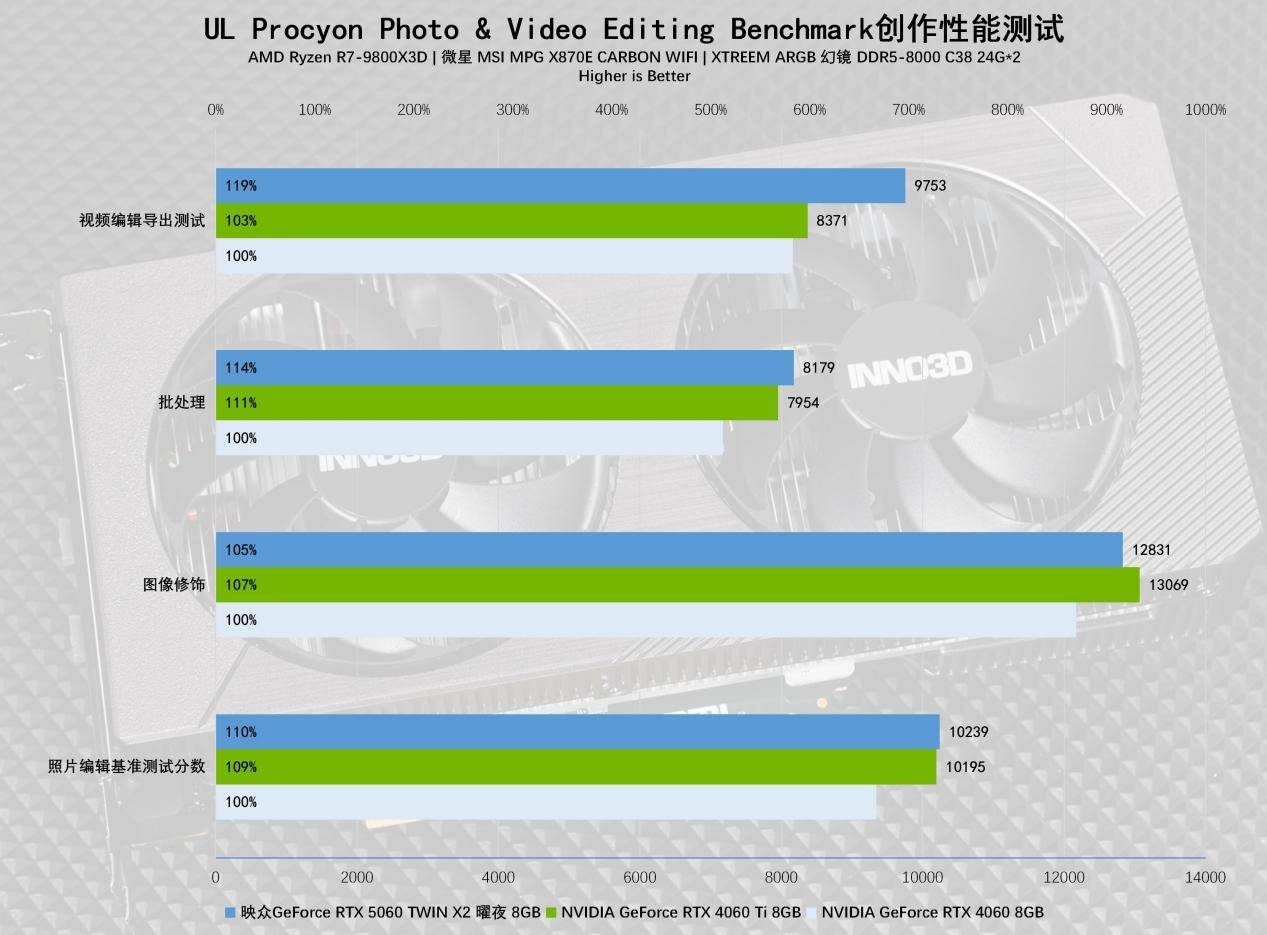 再看大伙关心的图像编辑与视频创作表现,我们采用UL Procyon进行测试,在图像编辑上映众RTX 5060曜夜与RTX 4060 Ti不相上下,不过对比RTX 4060时,性能领先9%左右,而在视频剪辑方面,映众RTX 5060曜夜的优势就比较大了,对比RTX 4060以及RTX 4060 Ti分别领先19%和16%。