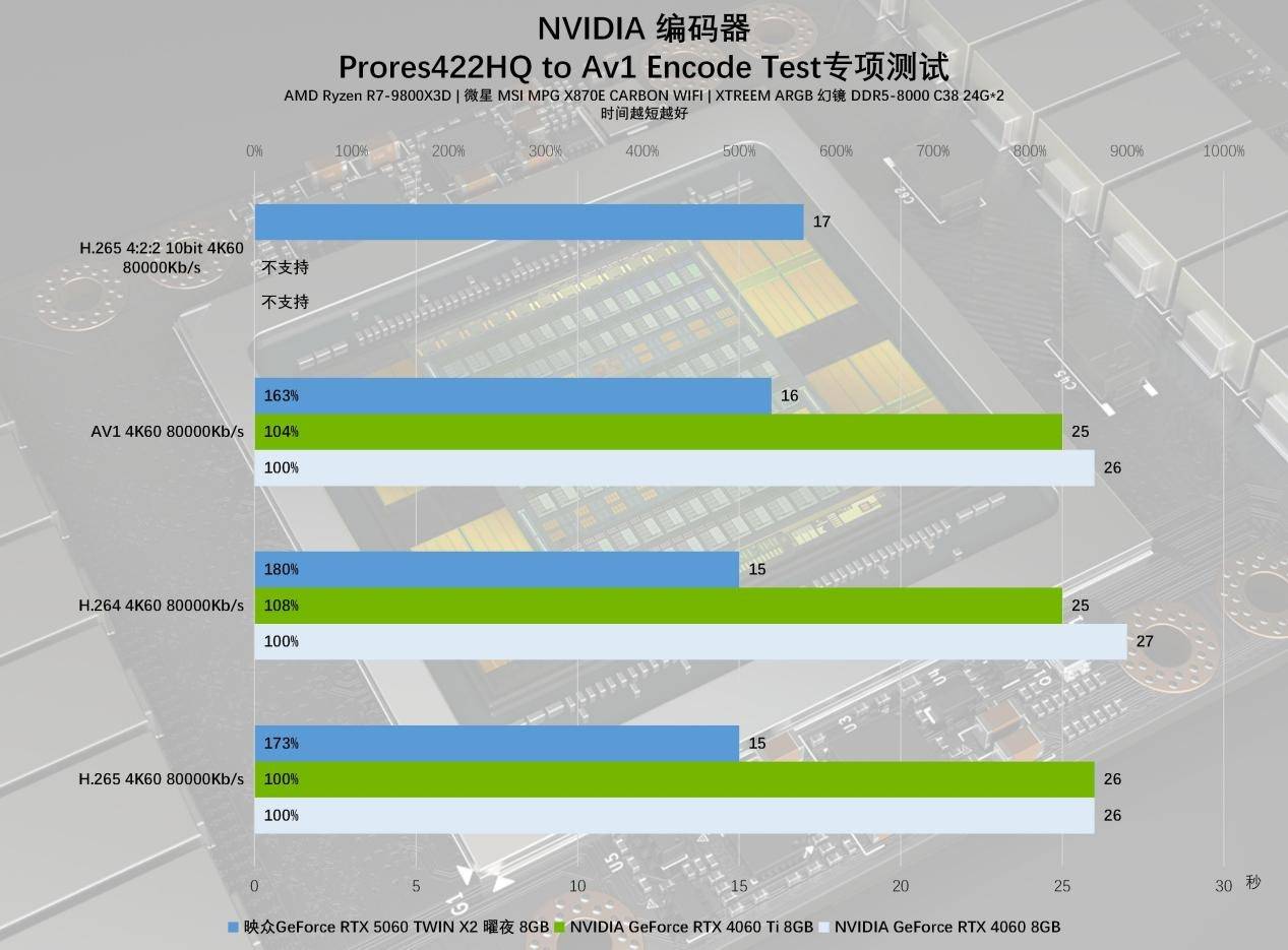在Adobe以及达芬奇的Benchmark测试里,映众RTX 5060曜夜相比两张前代的60级别显卡也是有不小的提升,不过提升比较大的还是视频编辑部分,究其原因还是这一代RTX 50系显卡对编码器进行了升级,不仅编解码的效率更高,同时支持的格式也更丰富。例如在达芬奇和PR的测试中,映众RTX 5060曜夜领先RTX 4060与RTX 4060 Ti超22%以上,总体来说就是内容创作的效率更高了。