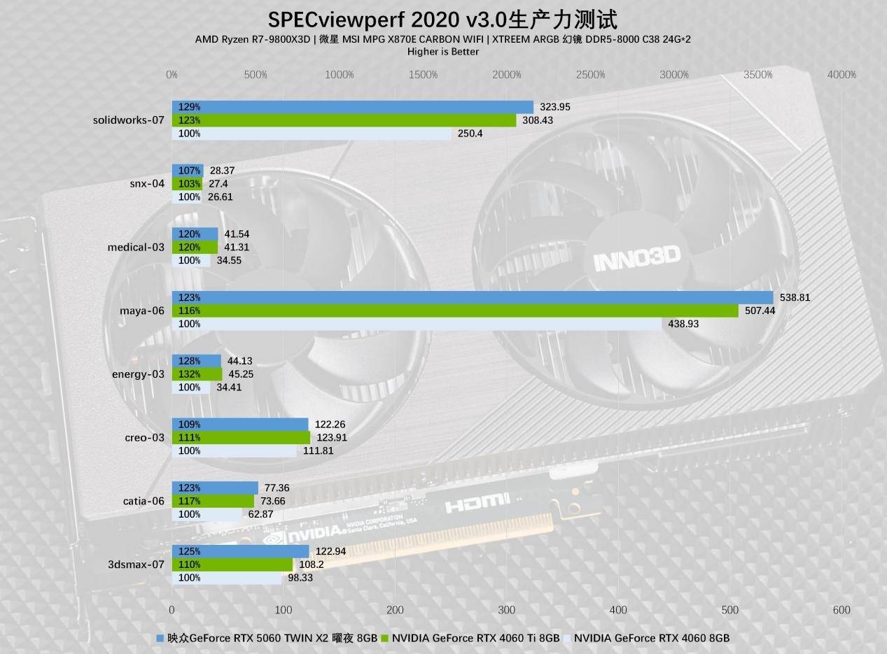 工业领域我们用的是SPEC2020进行测试,它能够反映显卡的整体工业能力,在多项测试中映众RTX 5060曜夜对比RTX 4060平均有20%的提升,部分项目领先幅度更大,而对比RTX 4060 Ti,两者也是互有胜负。