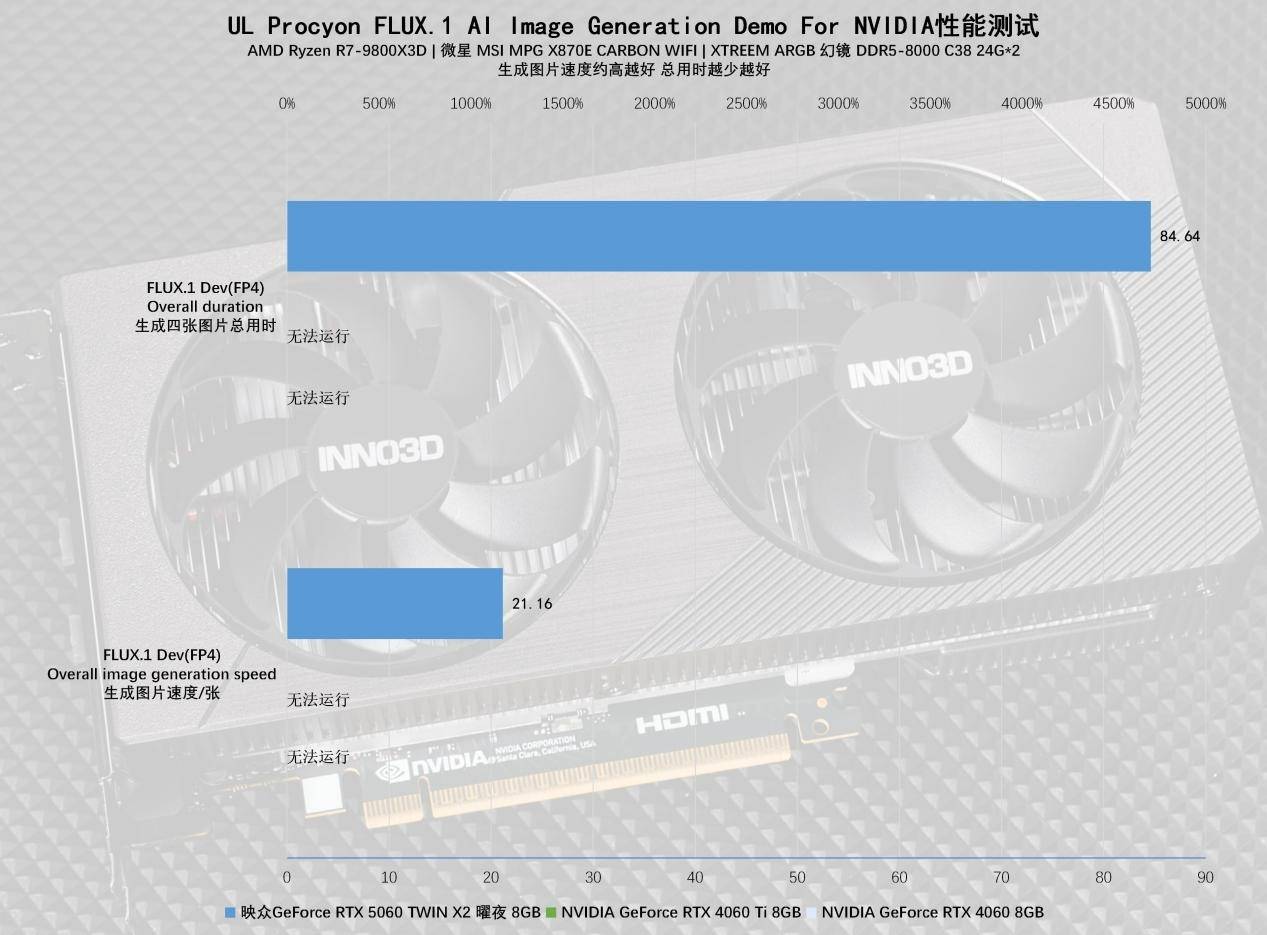 实测前代的两张60级别显卡因为显存不足,无法完成测试任务。而同样是8GB显存的映众RTX 5060曜夜凭借FP4精度模型的支持,能够顺利跑完测试,生成一张图片的用时为21.16秒,表现还不错。