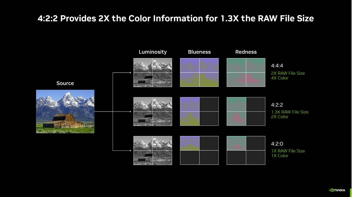 4:2:2色度采样的视频文件采用的是YUV颜色格式,与存储红色、绿色和蓝色(RGB)值不同,颜色被存储为亮度Y、蓝差色度U和红差色度V。在这类视频中,视频的完整亮度将被保留,而原始色度信息只保留一半,因此相比4:4:4的视频,其视频帧数据量仅有不到三分之二,而相比4:2:0的视频又能提供两倍的颜色分辨率,因此创作者采用这种格式拍摄,能够在保留更多色彩信息的同时还能减少文件大小和带宽需求。