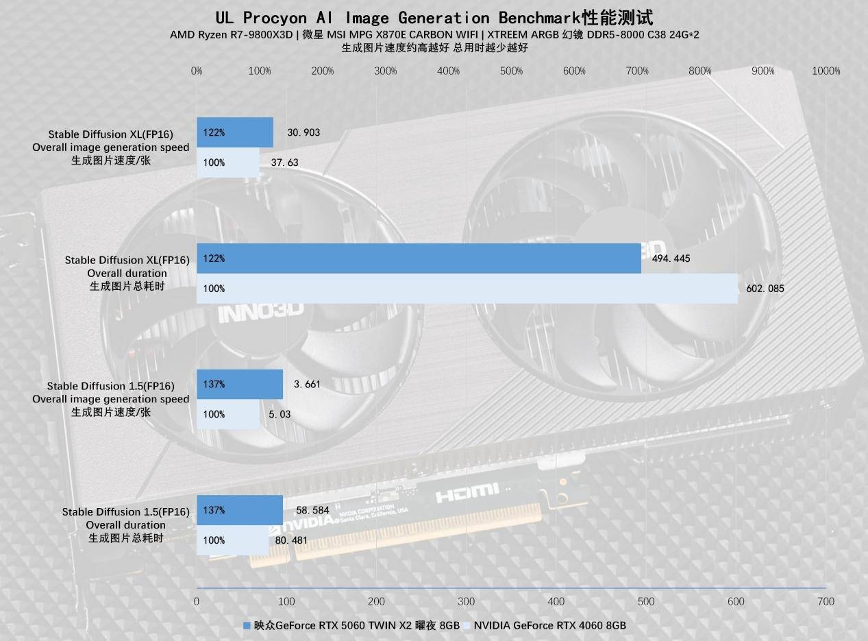 接着我们再看看映众RTX 5060曜夜在Stable Diffusion中FP16下的表现如何,还是用UL Procyon进行测试,在比较轻松的SD 1.5文生图测试里,映众RTX 5060曜夜的表现非常优秀,生成一张图的速度仅需3.66秒,效率比上代显卡快了37%。而即便是在压力比较大的SDXL中,优势也非常明显,生成一张图的速度为30.9秒,同样领先RTX 4060约22%。