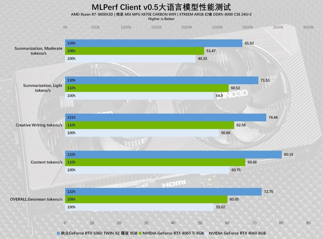 接着是本地大模型部署测试,我们用MLPerf Client v0.5大语言模型进行测试,它是基于meta的Llama 2 7B开源LLM打造,涵盖了四项AI任务,分别是内容生成、创意写作以及对两份不同长度文本进行总结摘要。实测新显卡在每一项中都表现出了绝对的统治力,各项测试均遥遥领先,对比RTX 4060 Ti性能提升幅度为20%,而对比RTX 4060则更进一步,领先约30%!