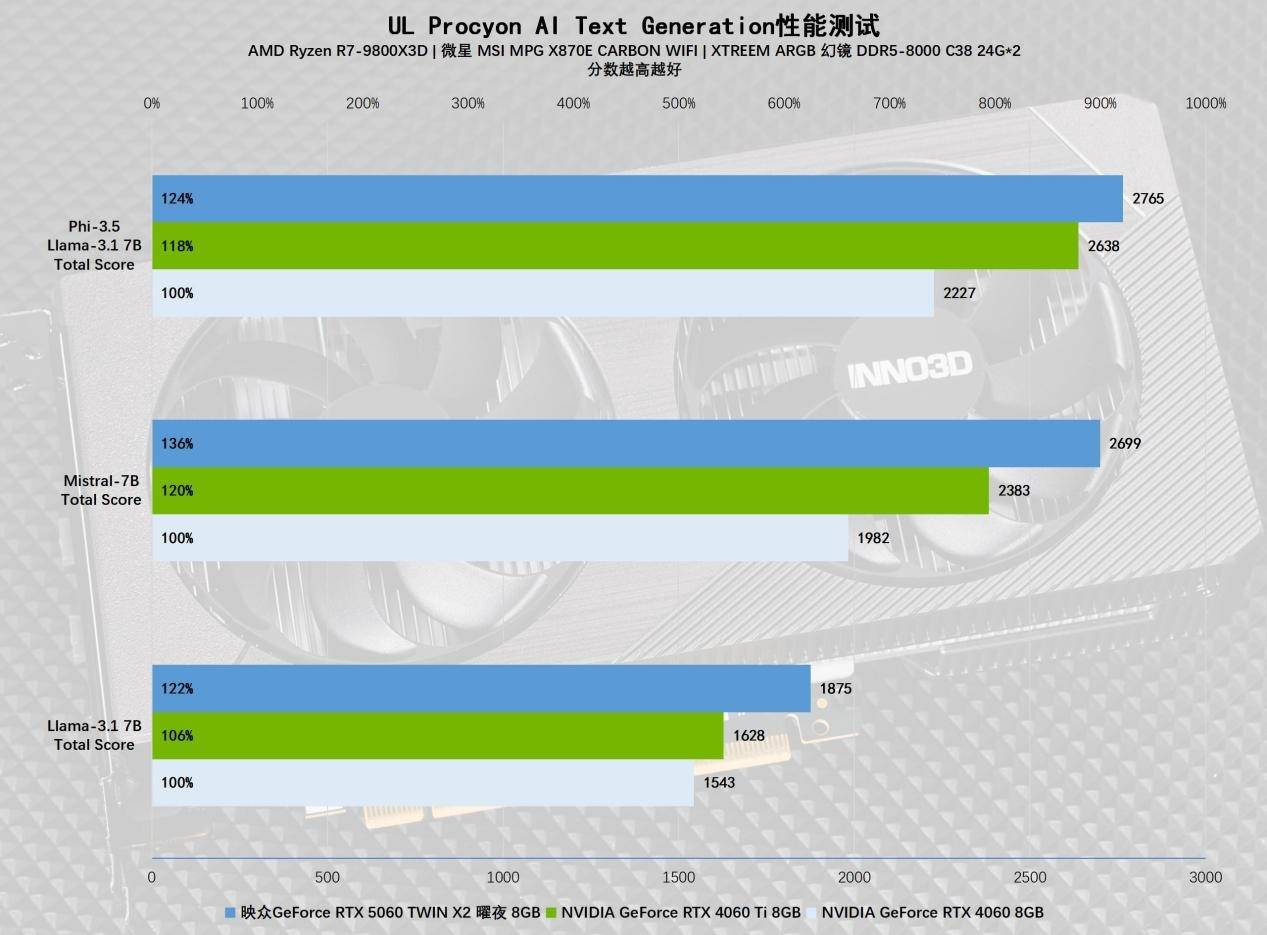 接着我们又用UL Procyon的AI Text Generation测试了更多的大语言模型,映众RTX 5060曜夜的优势依旧十分明显,综合性能对比RTX 4060提升约27%,面对RTX 4060 Ti,性能也有13%的领先优势。