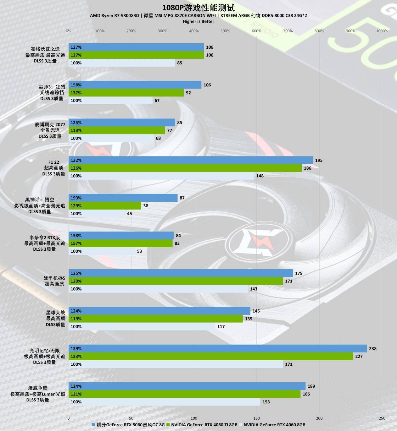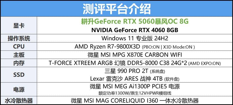 至于对标的测试显卡,我们这次拿出的RTX 4060 8GB、RTX 4060 Ti 8GB与耕升GeForce RTX 5060暴风OC 8G显卡进行性能对比,分别对理论性能、游戏性能、DLSS性能、创作能力、AI性能,以及功耗等不同维度的表现。