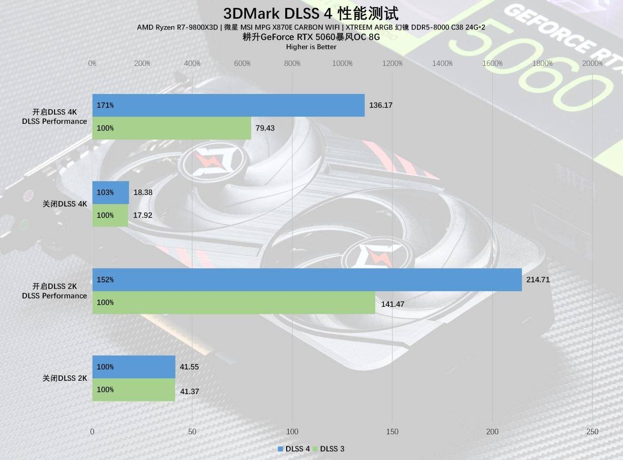 再看看DLSS 4的理论表现如何,还是经典的3DMark测试。不得不说耕升RTX 5060暴风OC搭配上DLSS 4后,帧数就跟打了鸡血一样,开关前后的性能简直天壤之别!其中2K分辨率下,开关前后性能差距足足有4倍之多。4K分辨率时帧数差距直接就是7倍。