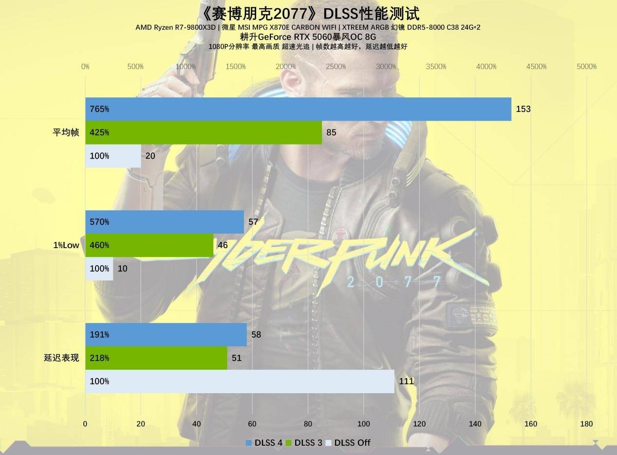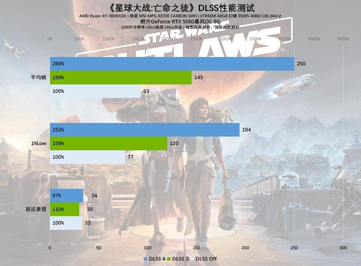 实测DLSS 4在这类优化欠佳的游戏中确实大有用处,在1080P原生分辨率下,耕升RTX 5060暴风OC的平均帧仅有77 FPS,整体游玩体验还不错。而开启DLSS 4质量档以后,游戏平均帧直接暴增至250 FPS,游戏体验如德芙般丝滑,对比原生1080P的表现,足足有2.7倍左右的提升。即便是对比DLSS 3的145 FPS,也是足足提升了100+ FPS。